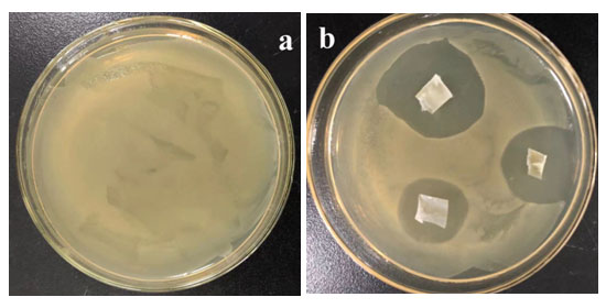 圖1. 培養基培養24小時后抗菌水管抑菌圈測試效果圖(a:對照樣;b:放置抗菌水管片樣)